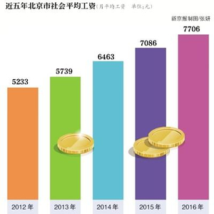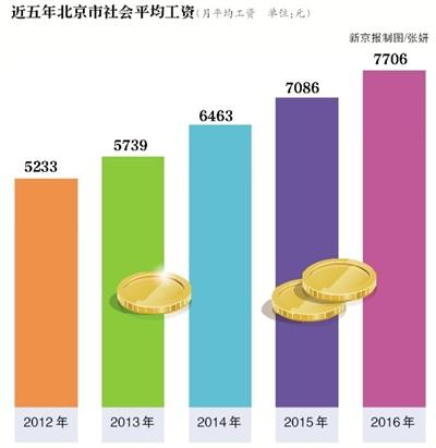 新京报讯 (记者吴为)北京市人社局、统计局日前正式公布了北京市2016年度职工平均工资,2016年度全市职工平均工资为92477元,月平均工资为7706元。这一数字比2015年月平均工资7086元增加了620元,上涨8.75%。
