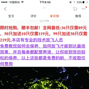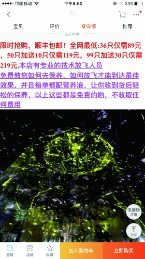 昨天,北京晨报记者在某购物平台上输入“萤火虫”等关键字,出现了上万条搜索结果。其中,一家店中有“25只一口价99元、30只135元、60只499元、150只900元”几种规格供选择。记者发现,即便萤火虫价格不菲且难以饲养,但三天内该店仍出售了129笔。