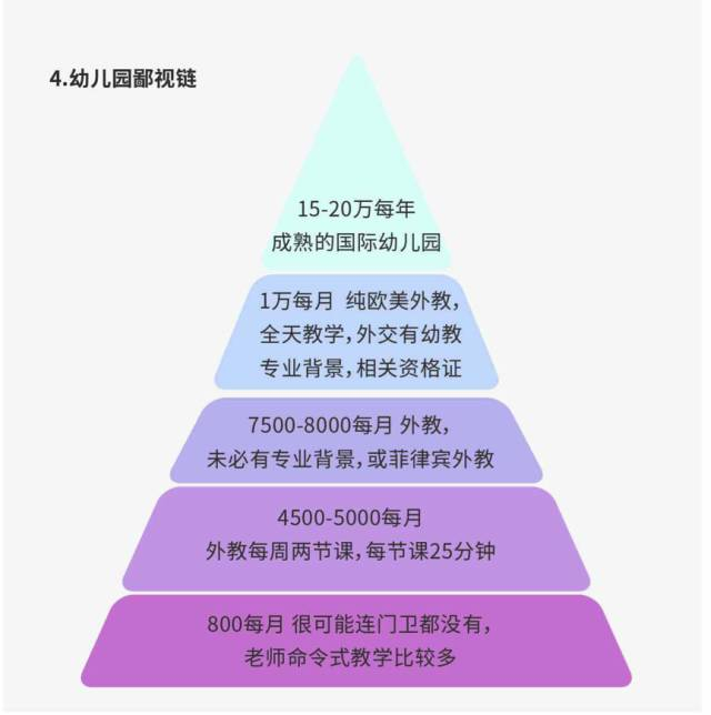 “我坚持面试全程和老师用英语交谈,因为这样我就能发现,哪些幼儿园的老师发音标准、语法正确,哪些是糊弄事儿的。”王富贵的妻子说,外籍教师的资质也是她的关注重点,外教必须通过国际相关幼儿教育机构考核,最好来自母语为英语的欧美发达国家,东南亚国家的英语外教只能是备选项。在她看来,有的幼儿园聘用一些毫无幼教经验的普通外籍人士,只是为了他们那一张“外国人的脸”。