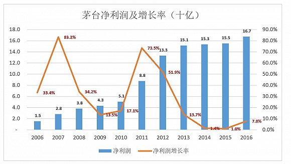 2006-2016年,茅台营收平均年复合增长率为26.9%。但最近3年,净利润同比增幅都是“个位数”:1.4%、1.0%、7.8%……
