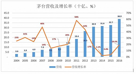 2004-2016年,茅台营收平均年复合增长率为26.1%。这12年大致可分为两段: