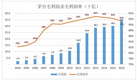 2004-2016年,茅台毛利润平均年复合增长率为24.8%,略低于营收增速。