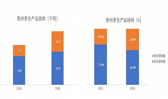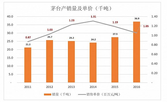 2016年,贵州茅台产量、销量创纪录地达到5.99万吨和3.69万吨,单价则进一步滑落到105万元/吨。不是因为茅台降价,而是产品结构发行了变化。