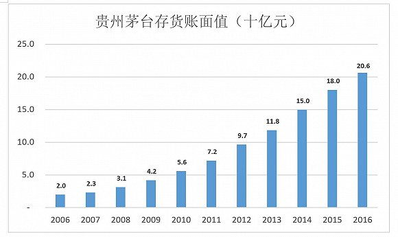 2005-2016年,贵州茅台存货账面值年均复合增长率达24.4%,几乎是产能扩张速度的一倍。