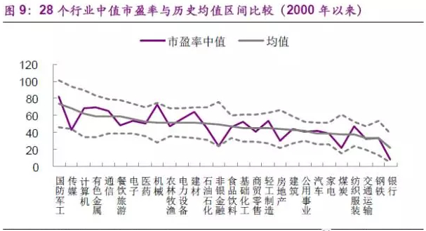 结构上看,28个主要行业的中值法市盈率均处于2000年以来的均值区间,18个行业估值低于历史平均水平。
