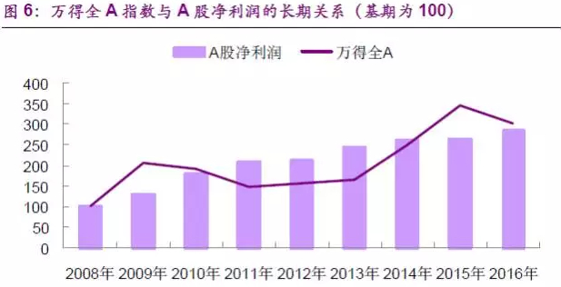 2009年-2016年的8年间,万得全A指数从1431点上涨至4310点,涨幅约为2倍,同期全部A股业绩增长了1.8倍,两者基本一致。