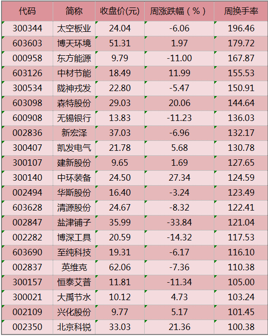 数据显示,上周共有21只个股换手率超过100%,理论上说,这些个股的筹码一周之内已全部易手。
