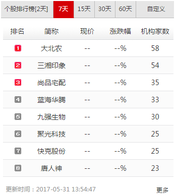 全景网机构调研宝典显示,过去一周,大北农(002385)、三湘印象(000863)、尚品宅配(300616)均接受了30家以上机构调研,位列深市个股排行榜前三名。
