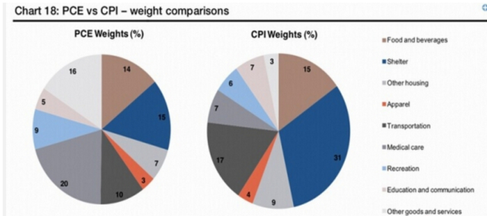 CPI只计算家庭支付出去的价格,而PCE包含了代表家庭对商品和服务的支付。比如,PCE在医疗保险上的权重比CPI高很多。因为除家庭实际支出之外,医疗保险往往是由企业或者政府来承担。此外,PCE包含了金融服务的假计成本(类似机会成本),这自然也不包含在CPI成分中。以上的两个PCE组成部分压缩了其他商品及服务在价格指数中的权重。此外,作为通胀的重要组成部分,房地产占到了PCE权重的15%,CPI却有31%,如下图: