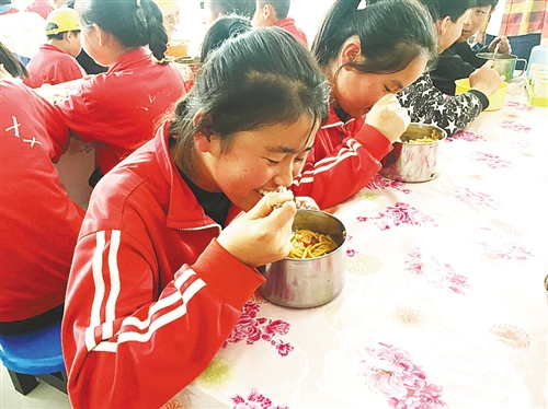 “如果学校没有营养餐的话,就只能从家里带馒头或者饼子来吃了。现在我每天早上都能吃到一个鸡蛋,中午能吃上热乎的饭菜。”在宁夏固原市三营镇甘沟小学食堂,正在吃饭的六年级学生海雪开心地说。当天的营养午餐是牛肉炒粉条、清炒土豆丝和紫菜蛋花汤。