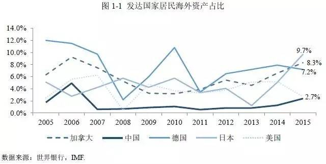 发达国家的投资结构数据表明,居民海外资产占全部资产的8-10%左右,其中海外资产占比最高的是日本,这也是其GNP远远高于GDP的决定性因素。其次是德国和加拿大,德国 “海外投资”占比比较高,这是与欧盟的自由投资制度环境有关。而加拿大是移民大国,本国实业的发展滞后于国民财富的增长,大量投资移民带来的财富依然以海外资产为投资标的。