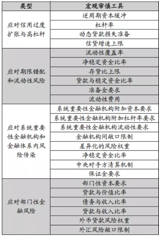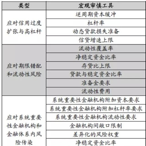 根据适用目标,宏观审慎工具可以划分为四大类。第一,应对信用过度扩张和高杠杆的宏观审慎工具。第二,应对期限错配和流动性风险的宏观审慎工具。第三,应对系统重要性金融机构和金融体系内风险传染的宏观审慎工具。第四,应对部门性金融风险的宏观审慎工具。