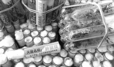 记者在另外两间昆虫天敌接种室内看到,这里每个房间约有30平方米,分别用来培养天牛的天敌肿腿蜂和花绒寄甲。其中在肿腿蜂专门的接种室内,技术人员把面包虫放入试管以后,再把肿腿蜂放入试管,并将管口用棉花塞紧。此后肿腿蜂会在面包虫身上产卵,一头肿腿蜂的产卵数量可达到几十粒。大概一个月时间,卵便孵化成肿腿蜂幼虫,并靠吸食面包虫身上的营养直至生长为成虫。