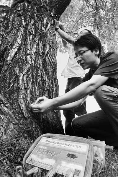 在位于北四环外的北京市园林科学研究院内,有一座充满神秘感的“天敌昆虫工厂”,还有一群整天和虫子打交道的“科学怪人”。这座总面积达300余平方米的“工厂”最主要的功能就是繁殖和复壮肿腿蜂和花绒寄甲,而他们也是害虫天牛的致命天敌。据统计,目前北京市园林科学研究院已经实现了肿腿蜂、花绒寄甲两种优势天敌昆虫的规模化生产,并在11家市属公园进行了推广示范,累计释放肿腿蜂约1000万头,花绒寄甲约100万头,将天牛危害率降至5%以下,有效控制了公园蛀干害虫的发生和危害。