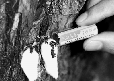 “这个试管中都是肿腿蜂幼虫,肿腿蜂的成虫只有三四毫米,别看它体量不大,却是害虫天牛的优势天敌”,市园林科研院园林植保研究所所长车少臣指着试管中正在繁育的幼虫告诉记者,“一根试管繁育的肿腿蜂数量最高可达上百头。繁育出来的肿腿蜂,在低温条件下能保存3个月以上。需要消灭害虫的时候,只要取出试管内的肿腿蜂,释放到植物的树干、树枝上就可以,它们会自己寻找天牛,并在其周围或天牛身体上产卵,卵孵化为幼虫后,从天牛身体上汲取营养,满足自己的生长需要。这样一来,就起到了消灭害虫的作用。”