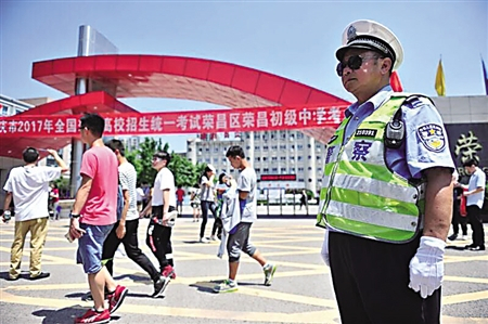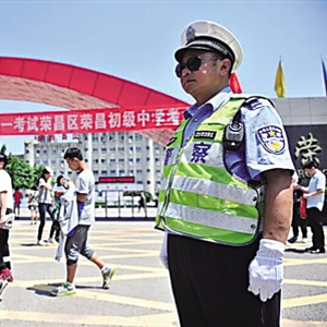 6月7日上午,范学进早早就来到了荣昌初级中学高考执勤点执勤。汗流浃背地指挥交通,引导考生。谈及刚做完手术还躺在病床上的老伴,范学进满是愧疚:“对不起,不能陪你做手术。”