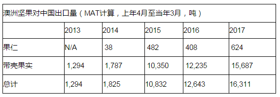 澳洲坚果协会向第一财经提供的数据显示,2012年4月至2017年3月间,澳洲坚果对中国出口量从1,294吨上涨到16,311吨,增长11.6倍。2014年4月到2015年3月,澳洲坚果对中国出口量(MAT)增长493%,迎来了在中国市场急速发展的大拐点。2016年底,中国市场占据澳洲坚果全球出口市场的32%,成为亚洲乃至全球最大的澳洲坚果进口国。