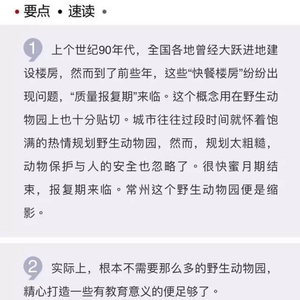 这个概念用在野生动物园上也十分贴切。轰轰烈烈地建设野生动物园,然而,规划很粗糙,动物保护与人的安全也忽略了。于是,有的动物园经营不善倒闭了,有的举债度日,勉强支持,乱象频出。