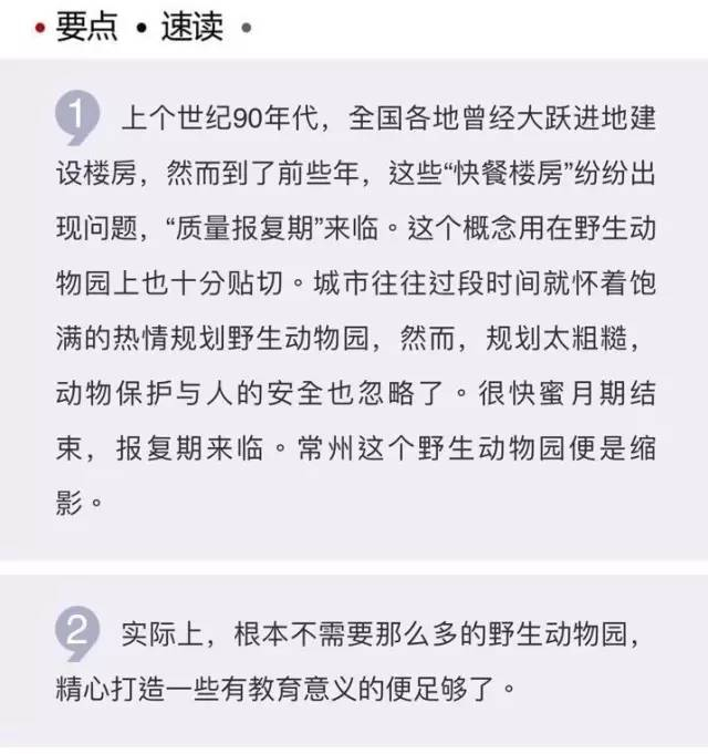 大跃进地建设动物园,过阵子就进入到报复期,很多城市循环往复,乐此不彼。然而,乱象频出的动物园其实展示的是城市的文明水平。真的不需要这么多动物园,不管是野生动物园,还是普通动物园,还是那些打着野生动物观赏幌子的各类名目的旅游项目。
