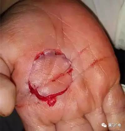 2015年,湖南长沙的一个2岁宝宝在家玩耍时,用手掌拔扫帚头,手掌搓出了一圈深深的血痕,导致肌腱断裂,关节囊破坏,右手需石膏固定3周,之后还需做功能锻炼。