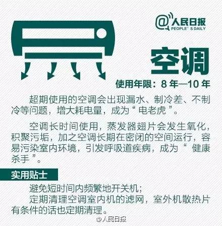 我们还要提醒您,生活用品也有保质期,特别是电视机、空调、洗衣机等家用电器,它们“超龄服役”造成的危险更甚!