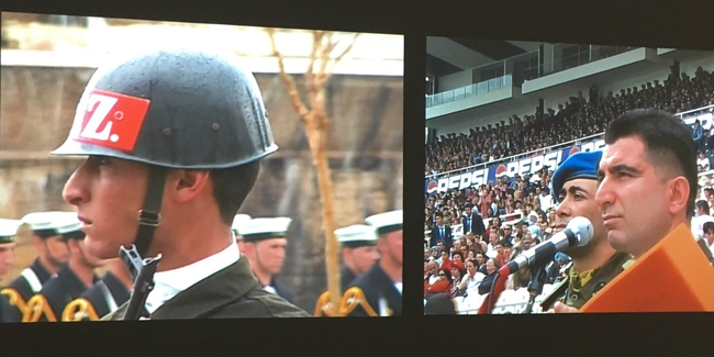 出生于1976年的伊斯坦布尔艺术家Köken Ergun创作于2005年的双频影像作品“我,一名士兵”,七分钟里大段同时播放着在土耳其某次国家阅兵仪式上两个不同人物的特写,站在话筒前发表演讲的首领、和在台下全程立正准备接受检阅的一名士兵。当首领开始高昂发言时,艺术家为之搭配了极其抒情的背景音乐,同时镜头里那名士兵的脸上几乎没有任何表情。