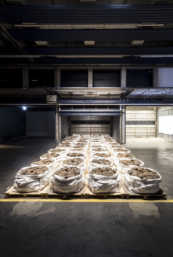 来自美国明尼苏达州的Dan Peterman关注的是废金属。他回收了大量黄铜和铁,许多都来自于旧船、废弃家电。这些金属被分类、熔化为砖头大小的块状,装在编织袋里,以“生产资料”的原始状态出现在展厅。艺术家认为这些金属块一方面连接了之前的形态,另一方面也与未来如何重新得到利用息息相关。