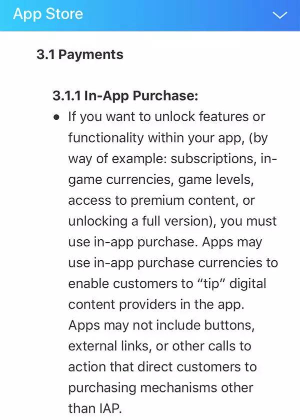6月11日,在苹果开发者网站上更新的《App Store审核指南》中指出,如果开发者想在iOS软件提供下述功能(比如用户订阅、游戏内虚拟货币、游戏级别、获取高端会员内容、或者提供完整功能版本等),则开发者必须使用软件内购买。
