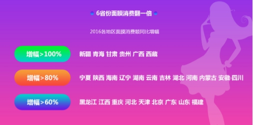 同时,面膜的增势突出。相对于防晒品,面膜本土品牌市场占比可观,且部分地区极具挖潜价值。2016年,帝都北京人拿下了人均面膜消费金额头名,超过上海、天津。27个省(市区)的面膜消费额增速超过60%,其中新疆、青海、甘肃、贵州、广西、西藏的消费额更是翻了一倍,增幅均高于100%。