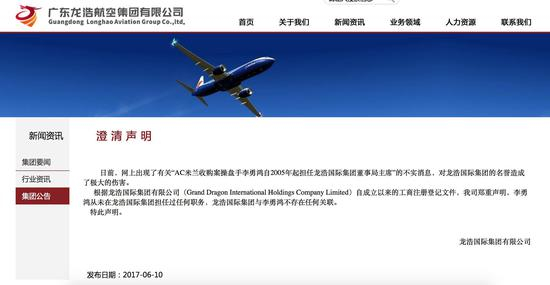 日前,网上出现了有关“AC米兰收购案操盘手李勇鸿自2005年起担任龙浩国际集团董事局主席”的不实消息,对龙浩国际集团的名誉造成了极大的伤害。