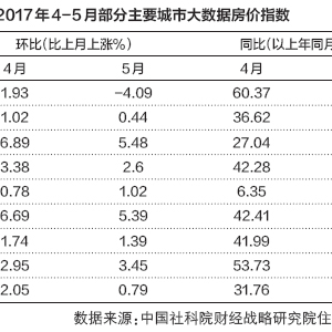 《报告》显示,在热点地区严厉的政策调控下,2017年5月热点城市房价涨速整体回落。其中,北京房价环比首次出现下降。