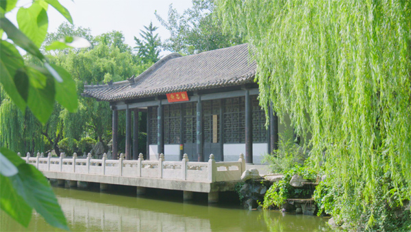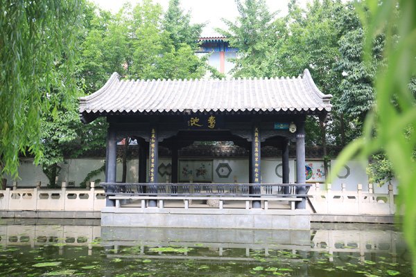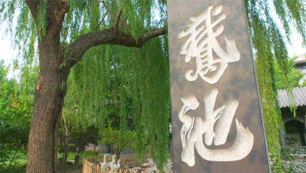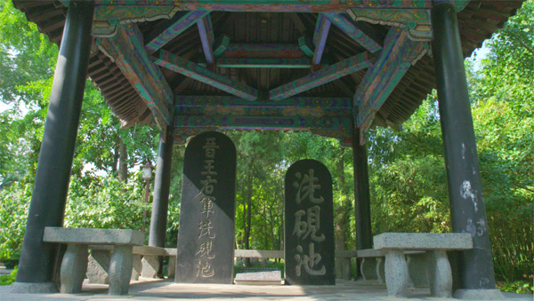 “洗砚池”池岸是假山怪石,池畔是垂柳花草。相传王羲之幼年刻苦练字后,经常到池中洗刷砚台,长时间后以至于池水呈墨色,于是人们名曰“洗砚池”,古代文人也称之为“墨池”。元代王冕有诗:“吾家洗砚池边树,朵朵花开淡墨痕。不要人夸好颜色,只留清气满乾坤。”