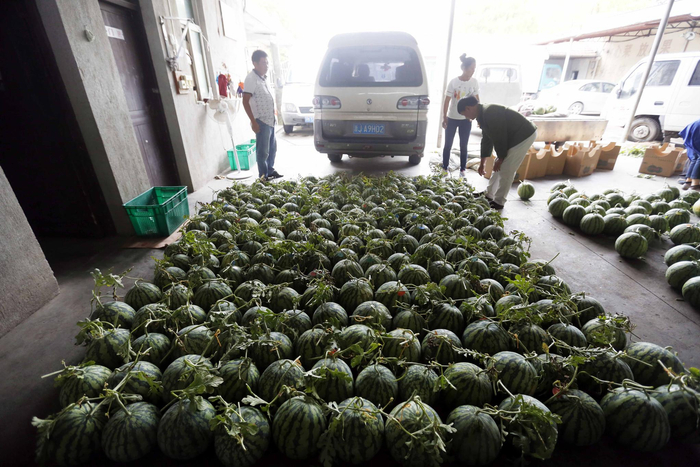 ▲ 天一亮,货车一辆接一辆,把刚从田里摘下来的西瓜卸下,交由朱林杰检验。