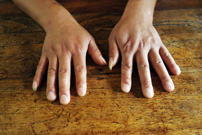 ▲ 每天对西瓜上千次的敲击,指尖长满了老茧,甚至指甲开裂,一度因为弹瓜手指化脓疼得睡不着觉。