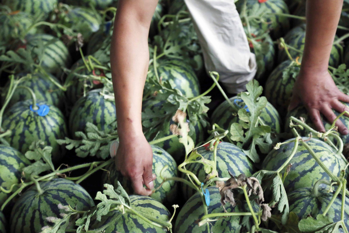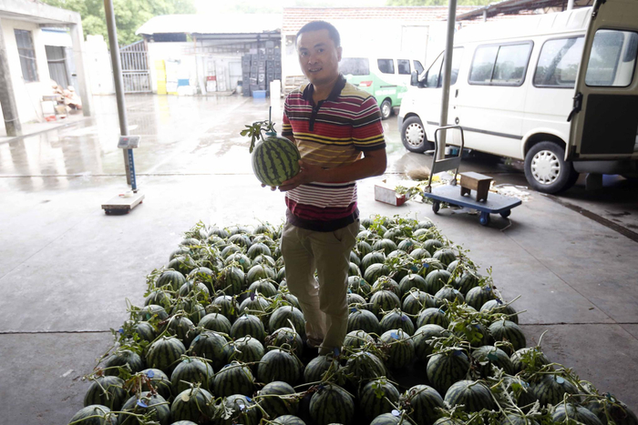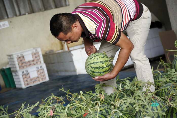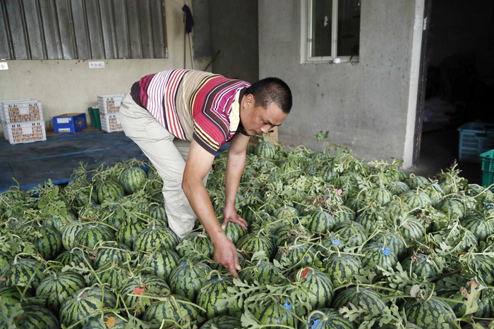 ▲ 作为验瓜师,朱林杰的工作主要是把关西瓜品质、挑选合格西瓜,并监督西瓜装箱配送。