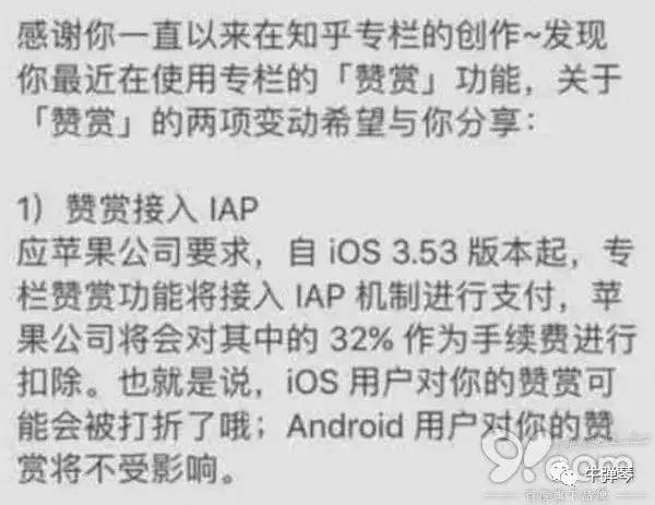 2、知乎已经妥协,发布公告称,其应苹果公司的要求,从iOS3.5.3版本的知乎APP更新之后,专栏赞赏功能将介入IAP付费机制,苹果公司将从中扣除32%作为手续费,也就是说,用户只能获得剩下的68%的赞赏分成。