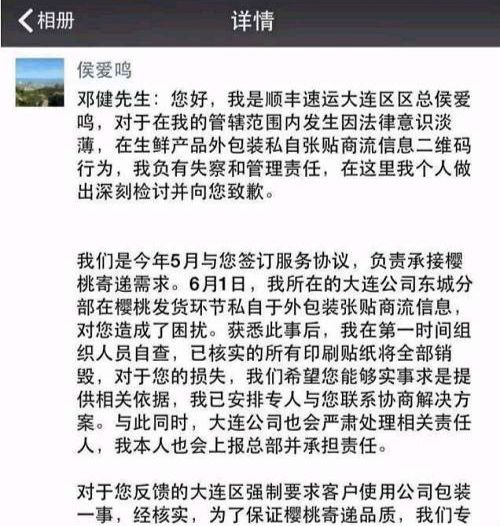 回应中提到,顺丰已在第一时间组织人员自查,已核实将所有印刷贴纸将全部销毁,并承诺依法做出补偿。此外,文中提到顺丰定制纸箱完全由客户自愿选择,通常在客户提供的樱桃外包装无法满足寄件条件情况下,工作人员会建议客户使用顺丰提供的樱桃专用包装。