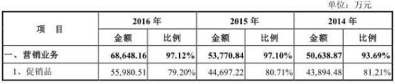 2012-2016年,公司促销品业务收入分别为64,096.76万元、51,402.18万元、43,894.48万元、44,697.22万元和55,980.51万元,占营业收入的比例分别为80.03%、82.47%、81.21%、80.71%和79.20%,占比保持在80%左右,是公司的核心收入来源。