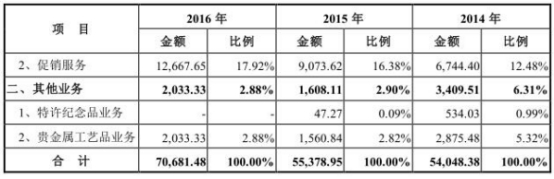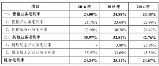 公司称,2014年、2015年,公司主动调整经营策略,减少承接毛利率较低的业务订单,并重点发展毛利率更高的促销服务业务,综合毛利率维持在较高水平。2016年,公司重点开发的促销品业务客户伊利的收入实现突破式增长,为扩大市场份额公司对伊利采用了相对较低的报价策略,毛利率水平较低,导致综合毛利率略有下滑。