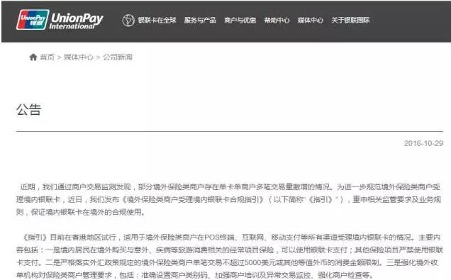 2016年10月29日,银联国际发布《境外保险类商户受理境内银联卡合规指引》,重申监管要求,强调境内银联卡在境外刷卡买保险必须合规使用,主要内容包括: