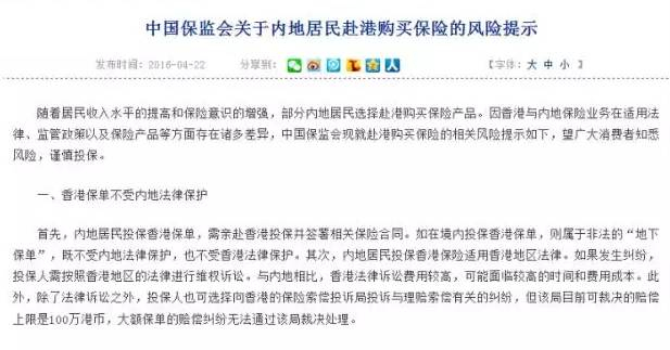 2016年4月22日,保监会官网发布《关于内地居民赴港购买保险的风险提示》,正式拉开了规范境外购买保险的帷幕。