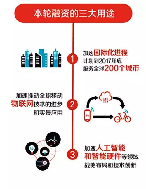 摩拜单车联合创始人兼CEO王晓峰介绍,新一轮融资将主要用于三个方面:加速国际化进程,加速推动全球移动物联网技术的进步和实景应用,以及加速在人工智能、智能硬件等领域的战略布局。