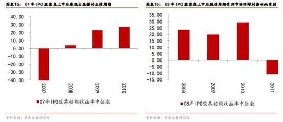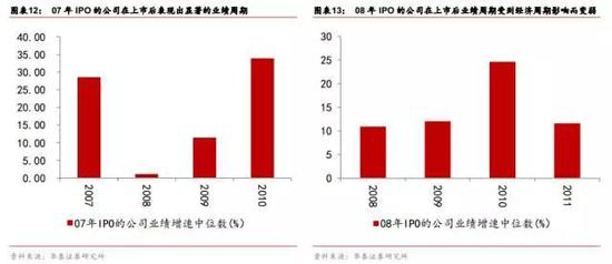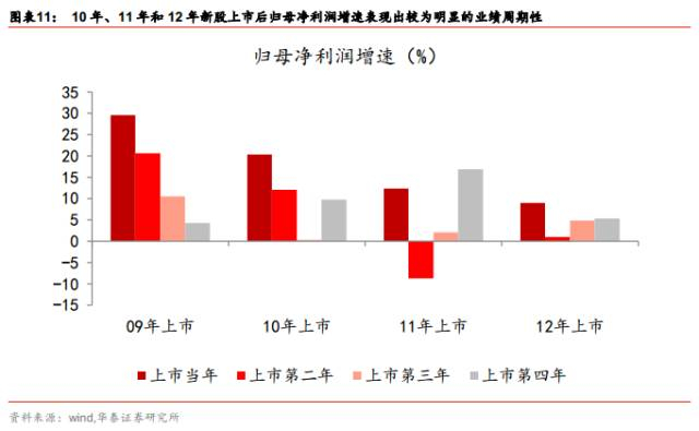 所以将上市新股的业绩汇总到一起,我们可以发现比较显著的周期性,即上市公司当年业绩往往比较好,第二年、第三年业绩会明显下滑,第四年实际控制人等持有的股票解禁,业绩会好转。