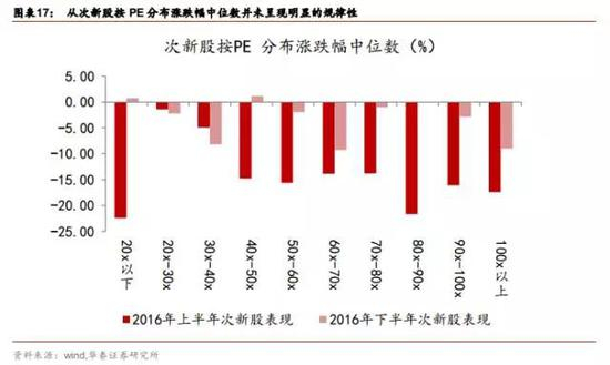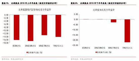 汇总次新股在2016年上半年和下半年的表现,在2016上半年,初始次新股相比发行价溢价跟次新股在二级市场的表现没有明显的规律性;而下半年,初始次新股溢价前50%分位的次新股二级市场的表现远远好于后50%分位的二级市场表现。
