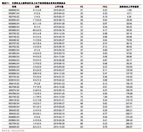 根据上面的筛选次新股的指标,选择PEG处于0至1之间(同时尽量选择低PE),上市时间处于2014年12月至2015年5月之间,现价相比发行价溢价低于300%,满足这三个条件的个股梳理如下表。