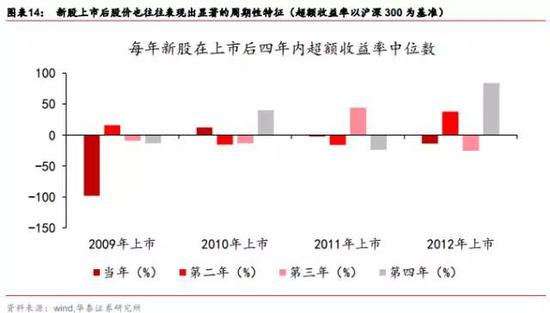 次新股有较为明显的业绩周期和股价表现周期,A股由于新股上市门槛较高,拟上市公司为了增加上市概率,上市当年的业绩往往较为靓丽,未来业绩很可能被透支,因而上市公司业绩在上市之后经常出现下滑,但随着透支的业绩被消化,以及实际控制人解禁、股价诉求提升,上市公司的业绩和股价在第四年往往有较为强势的表现。