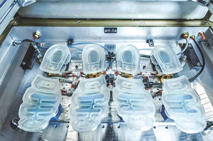 霍尔茨手里拿着一只鞋,这只鞋和悬挂在他身边的那些鞋完全一样:它的名字叫VaporMax,其与众不同的特点是拥有一个类似于气泡膜的鞋底。没有泡沫材料,没有橡胶,只是采用了透明的热塑性聚氨酯弹性体(TPU),这种管状的袋子里面注入了空气(准确地说,是氦气)。霍尔茨说: