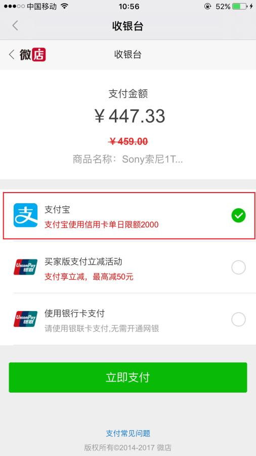 微店买家版APP中支付宝可正常使用。图片来源:微店截图