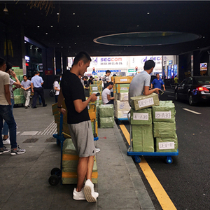 2017年6月,华强北经典的“一天”从午后开始。铁拖车的四个轮子磨过水泥地,当,当,当,当,逐渐敲醒华强北的白日。商场里撕胶带的声音渐次响起,价值几十万元的电子产品或元器件,封进一个个棕色纸箱中,在拖车上垒到半人多高。这些随处可见的铁拖车拖过崭新的步行街,和主街背后仍旧脏乱的巷子,在仓库、商场、停车场、居民楼中办公与住家合用的店铺之间,铺开一张流动的毛细血管网络。