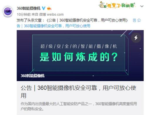 360公司在2014年推出智能摄像机产品,一直深受用户喜欢,现已成为国内出货量最大的智能安防产品之一。央视报道播出后,360智能摄像机技术及产品团队在其官方渠道发布信息,称经技术团队严格核查,360智能摄像机产品安全可靠,不存在风险漏洞,用户可放心购买使用。